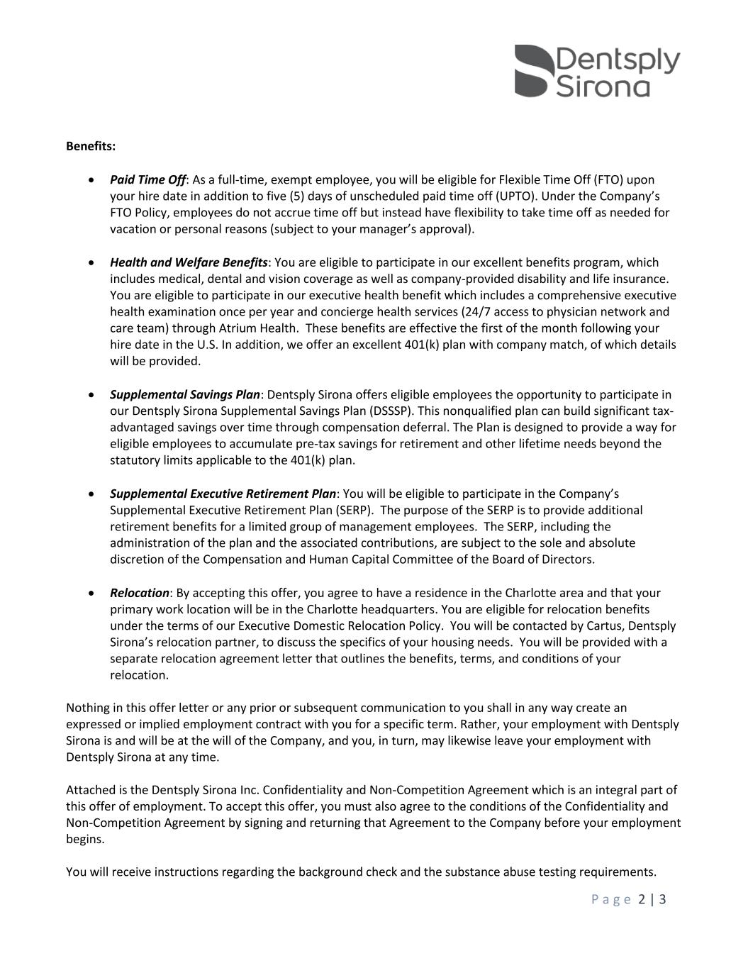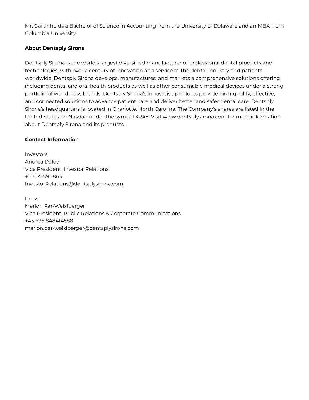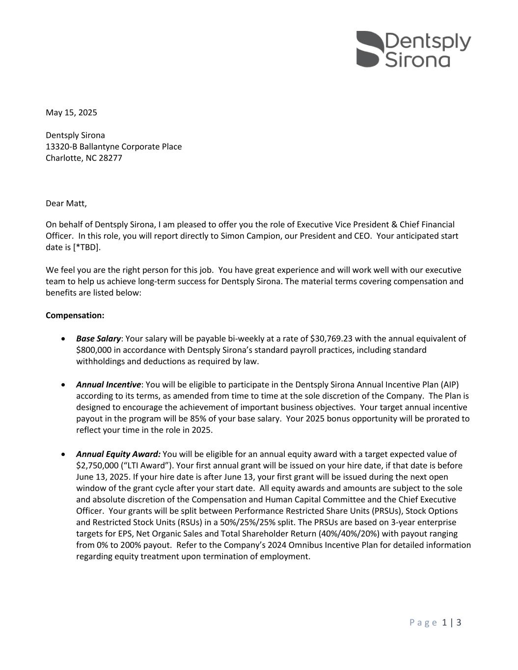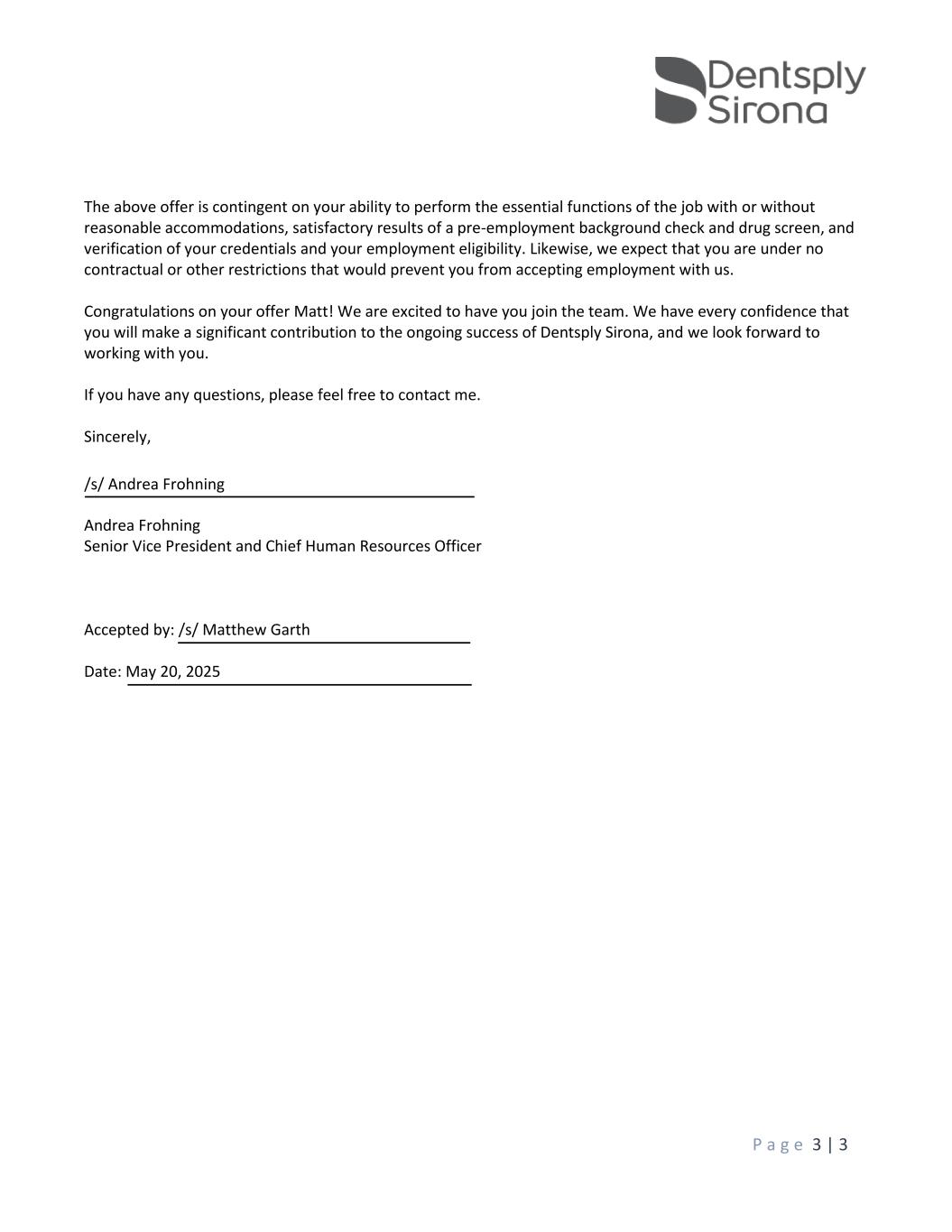 | | Offer Letter between DENTSPLY SIRONA Inc. and Matthew E. Garth, entered into as of May 20, 2025 |